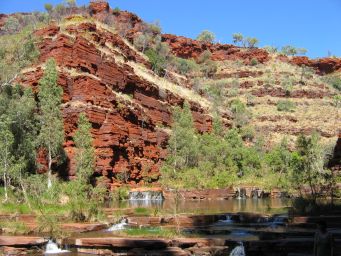 Im Karijini NP haben wir Flussschluchten erkundet, waren schwimmen und haben quasi eine warme Dusche unterm Wasserfall genommen. Das war auch bitter noetig, weil wir von der Dirt-Road und dem undichten Auto total eingestaubt waren. Grosse Teile unseres Hab und Guts ist dementsprechend von rotem Staub ueberzogen. Juergens Haare sahen ein bischen wie Hennagefaerbt aus. In der Weano-Gorge haben wir dann noch Canyoning auf eigene Faust gemacht. An manchen stellen war's nicht breiter als ein halber Meter bei 10-15 m tiefer Schlucht.