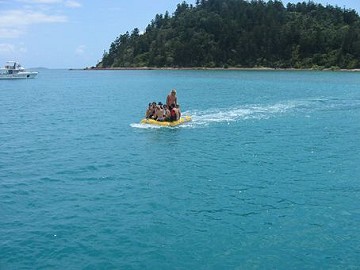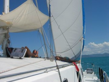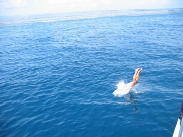 Nach unserem kurzen Besuch in Airlie Beach stechen wir also abends mit dem Katamaran, der Pacific Star, in See. Im Hafen erleben wir bereits unsere erste Ueberraschung. Bei der Ausfahrt aufs offene Meer sehen wir 2 Delphine, die ihre Runde im Hafenbecken ziehen. An Bord ist eine lustige Truppe gemischt aus Aussies, Amis, Brits, Suedafrika und natuerlich Deutsche. Deutsche trifft man hier einfach ueberall, das ist wirklich unglaublich. Egal welcher Ort: City, Beach, Outback oder Rainforest und egal welche Taetigkeit: tauchen, segeln, wandern, die Deutschen sind immer zugegen. Wir sind halt ein lustiges Reisevoelkchen.