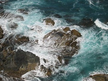 Steilkueste aus Sandstein mit Boegen und Bruecken, mit kleinen Inseln, wie den 12 Aposteln und blauem Meer, geformt von der immerwaehrenden Brandung.
