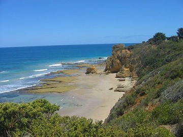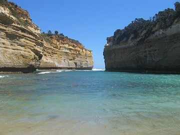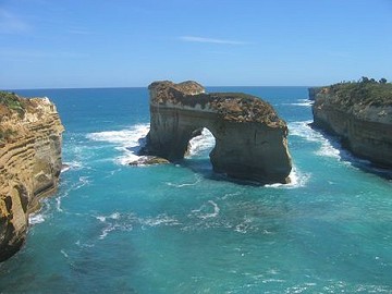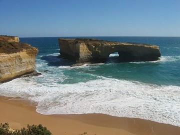 Kueste in zwei grossen Boegen ins Meer hinaus, bis 1990 ein Bogen eingestuerzt ist. Seitdem steht nur noch ein Bogen im Meer, bis auch dieser ausreichend unterspuelt ist und einstuerzt. Trotztdem ist die London Bridge immer noch eine impossante Erscheinung.