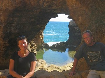 gigantisch und Juergen haelt mal die Fuesse ins Wasser. Ups, ist das kalt. Na baden waere sowieso nicht drin. Dann kommen die 12 Apostel, ein riesiger Parkplatz rechts der Strasse und eine Unterfuehrung nur fuer Touristen fuehrt nach links zum Meer. Eigentlich sind ja von den 12 Aposteln nur noch 11 uebrig, seid 2003 eine der Sandsteinformationen eingestuerzt ist. Dieser Kuestenabschnitt, das Meer und die Brandung sind ja schon ganz nett, ebenso die skurilen Sandsteinsaeulen der 12 Apostel, die durch Erosion der Kueste uebriggeblieben sind. Ob das langt, um die Great Ocean Road zu einer Legende zu machen? Zu dem wimmelt es hier nur von Touristen.