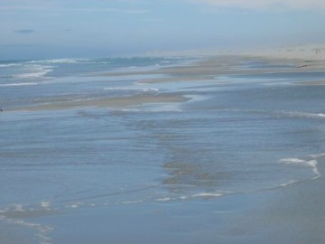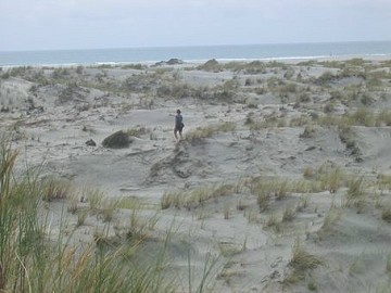 Nach all diesesn wahnsinnigen Attraktionen erreichen wir schliesslich unser kleines, aber feines Ziel. Wir hatten es uns anfaenglich gar nicht sooo toll vorgestellt, aber eine Wanderung ueber den Farewell Spit ist einfach unbeschreiblich schoen. Zunaechst laufen wir auf der einen Seite auf unzaehligen Muschelschalen am Strand entlang. Dann fuehrt der Weg durch wild bluehendes Gestruepp ueber eine Duene auf die andere Seite der Sandbank. Man spuert den Sand zwischen seinen Zehen, hoert das Meer rauschen und der Wind faehrt durch die Haare. Es ist so ein friedlicher Ort, keine Menschenseele weit und breit zu sehen. Die Voegel nisten am Strand und lassen sich nicht weiter durch unsere Anwesenheit stoeren. Man kann die Natur mit allen Sinnen geniessen und spuert ein unbeschreibliches Gefuehl der Freiheit und Zufriedenheit. Wir spazieren einige Zeit ueber die Sandbank, bis wir wieder am Parkplatz eintrudeln.