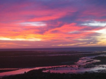 Frueh am Morgen wacht Juergen auf und schaut aus dem Fenster. Der Himmel ist blut rot gefaerbt und die Wolken leuchten in allen Farben der Sonne. Die Augen wollen zwar noch nicht richtig aufgehen, doch das muss unbedingt durch die Linse festgehalten werden. Also raus aus dem Schlafsack und rein in die Badelatschen. Aus den wenigen Schritten fuer ein Photo der Morgenroete wird schliesslich eine kleine Wattwanderung, da der Anblick einfach gigantisch ist.
