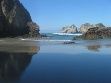 Von dort geht es weiter zum Wharariki Beach, der mit einigen Gesteinsformationen zu Lande und im Wasser aufwartet. Wir klettern ueber einige Felsen, schauen hier und da in ein paar Hoehlen, die die Ebbe frei gelegt hat und treffen auch auf einen Seehund, der faul am Strand liegt. Nur den kleinen Nachwuchs, der sich um diese Jahreszeit hier am Strand tummeln soll, koennen wir leider nicht entdecken. Egal, es war so ein herrlicher Tag und der kroenende Abschluss sollte ja erst noch kommen ...