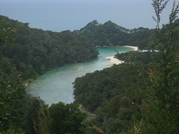 Man kann leider nicht ignorieren, dass Abel Tasman zu einer der Hauptattraktionen gehoert, aber wir lassen uns davon nicht stoeren und machen uns auf den Rueckweg, den wir zu Fuss beschreiten wollen. Der Pfad fuehrt entlang der Kueste und hinter jedem Bogen verbirgt sich eine kleine Bucht, mal mehr und mal weniger erschlossen. Die Kajaks huepfen wie bunte Baelle auf dem Meer. Wir machen auf einer etwas vorragenden Spitze Mittag und geniessen die Aussicht. Gerade noch zur rechten Zeit, denn nur kurz darauf ist ein Unwetter im Anmarsch. Wir setzen unseren langen Weg fort und es beginnt zunaechst mit Blitzen, gefolgt von Donner und schliesslich regnet es auf uns herab. Wir stellen uns fuer eine Weile unter, doch sehen schon bald ein, dass es nicht viel nutzen wird, denn wir muessen noch gute 3 - 4 Stunden laufen, um zu unserem FraNZcar zu gelangen. Eine Weile rennen wir, in der Hoffnung, dass es doch bald aufhoert oder einen besseren Unterschlupf zu finden. Der Boden ist matschig und in den Kurven rutschig, tlw. ist er binnen kuerzester Zeit ueberflutet, da das Wasser keinen Abfluss findet. Irgendwann gehen wir nass bis auf die Knochen wieder zum Laufen ueber. Nach einer schier endlosen Zeit gelangen wir schliesslich am Parkplatz an und koennen uns trockene Klamotten ueberstreifen. Der Ausflug in den Abel Tasman NP hat uns aber trotzdem gut gefallen, denn es war auch mal beeindruckend ein Gewitter so haut nah mit zu erleben.