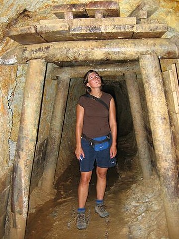 Hier wurde frueher Gold abgebaut, das mittels Waggons ans Tageslicht gebracht wurde. Die Helligkeit der Oeffnung in unserem Ruecken verblasst zusehends, dafuer gewoehnen sich die Augen langsam an die Dunkelheit vor uns. Die Taschenlampe weist uns den Weg durch den schwarzen Tunnel. Der Boden ist ziemlich matschig und wir muessen jeden Schritt mit Bedacht gehen, um nicht auszurutschen oder in eine Pfuetze zu treten. Durch Zufall entdecken wir, dass die Akkustik im Stollen atemberaubend gut ist und stimmen ein Liedchen an. Ein Konzert unter diesen Umstaenden haette sicherlich seinen besonderen Reiz. Hier und da gibt es Abzweigungen, die wir kurz beaeugen, wir bleiben aber wie empfohlen stets auf dem Hauptweg, da wir nicht ploetzlich in einem Loch im Boden verschwinden wollen oder aehnliches. Nach einer Weile, der Tunnel ist angeblich nur 500m lang, aber in der Dunkelheit verschaetzt man sich gerne mal in der Zeit und mit Entfernungen, wird es auf der anderen Seite licht. Der anfaenglich kleine Fleck in der Ferne wird immer groesser und groesser bis wir schliesslich blinzelnd durch die Oeffnung wieder ins Freie treten.