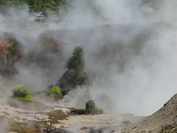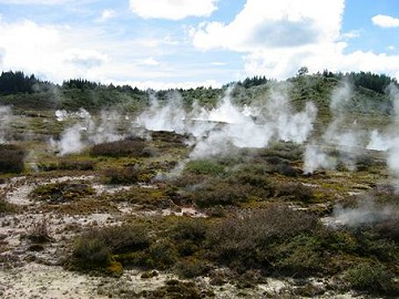 Von Taupo fahren wir ueber die Huka Falls in Richtung Rotorua. Am Vormittag besichtigen wir die sogenannten "Crater of the Moon". Eine wild zerklueftete Landschaft mit hagerem Bewuchs, denn es gibt nur wenige Pflanzen, die dieser Hitze gewachsen sind. Ueberall steigt Dampf aus dem Boden und an vereinzelten Stellen blubbert es vor sich hinr. Auf dem Parkplatz werden wir noch freundlich darauf hingewiesen, dass wir unsere Wertsachen nicht im Auto lassen sollen. Unsere Wertsachen haben wir eh immer dabei und was sollen sie uns sonst noch klauen ? :) Wir koennen also unbesorgt und ganz in Ruhe die bizarre Gegend erkunden.