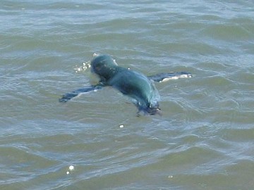 Juergen bemerkt auf einmal Bewegung im Wasser und entdeckt zu unserer Ueberraschung einen kleinen Blue Penguin. Er schwimmt munter zwischen den Badenden am Strand entlang. Der Kleine muss sich wohl verirrt haben, denn angeblich sind die Pinguine tagsueber zum Jagen draussen im Meer und kommen erst abends nach Sonnenuntergang zurueck zum Strand. Und scheu wirkt dieser quirlige Ausreisser schon gar nicht. Wir beobachten eine Weile, wie er wie eine Rakete durch das Wasser schiesst und die menschlichen Bojen gekonnt umkreist. Ueber eine lange Bruecke erreichen wir Tauranga und setzen unsere Fahrt zur Coromandel Peninsula fort.