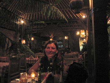 Am Abend gehen wir in ein kleines, aber feines Restaurant und goennen uns ein super leckeres 4-Gang-Menue incl. Longdrink fuer sage und schreibe umgerechnet etwa 3,50 Euro pro Person. Zur Vorspeise gibt es Suppe, als Zwischengang Gemuese mit Erdnusssauce, der Hauptgang besteht aus Variationen mit Huehnchen, Schwein und Shrimps dazu Reis, zur Nachspeise Bananapancake mit Schokosauce verziert. Mmmhhh ... Um den Genuss abzurunden wir das heimisch uebliche Getraenk "Arak attack" (regionaler Schnaps mit Honig und Sprite gemischt) gereicht.