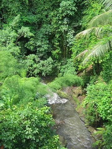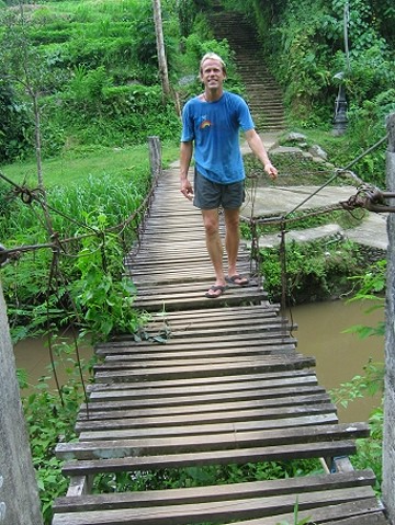Am naechsten Tag ziehen wir gleich zu Fuss los (Rad schieben bzw. schleppen ist dann doch nicht so unser Ding). Unser Ziel ist diesmal der Ayung River. Durch gruenes Dickicht bahnen wir unseren Weg und werden tatsaechlich fuendig. Das war gar nicht so einfach, aber schiesslich stehen wir vor der "Holzbruecke" oder wie auch immer man dieses Gebilde nennen will. Auf dem Fluss wird zwar Rafting angeboten, aber wir verspueren keine grosse Lust auch nur eine Zehe in das truebe Wasser zu stecken trotz sengender Hitze. Es ist schon etwas abenteuerlich ueber die wackeligen Planken zu laufen mit Blick durch die mehr oder weniger grossen Ritzen auf das rauschende Wasser