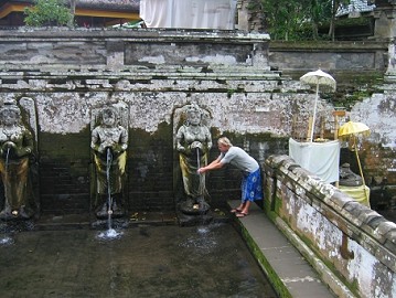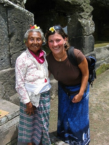 Eines morgens beschliessen wir die naehere Umgebung mit Fahrraedern zu erkunden. Wir leihen uns zwei Drahtesel und ziehen los. Ausserhalb der Stadt bei der ersten Ansteigung reisst die Kette von Juergens Rad. Tja, da werden wir wohl den restlichen Weg laufen muessen :) Wir besichtigen einige Tempel und fahren durch kleinere Ortschaften auf deren Strassen sich die Schulkinder auf dem Heimweg befinden. Bei Yeh Pulu ziehen wir mal wieder unsere Tuecher aus dem Rucksack und binden sie uns um. Eine kleine goldige Oma sortiert Blumen vor dem Tempel und beginnt herzlich zu lachen bei unserem Auftritt. Ihre braungefaerbten Zaehne, vermutlich von Tee oder Betelnuss, kommen zum Vorschein, aber machen das Laecheln nur sympathischer. Mit einem Grinsen deutet sie auf unsere Tuecher "Sarong, Sarong". Schliesslich nimmt sie uns bei der Hand und fuehrt eine kleine Zeremonie mit uns durch. Wir werden mit Wasser