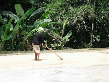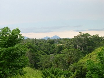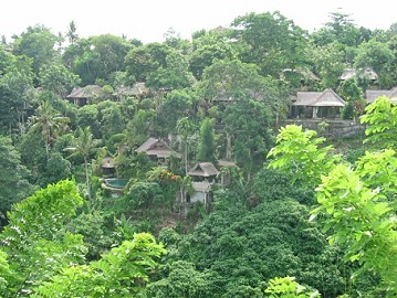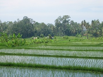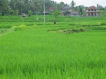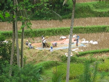 darunter. Ueber eine steile Steintreppe, auf der die ausgebufften Haendler jeglicher Art bereits sitzen und auf potentielle Opfer (aeh, Kaeufer !) lauern, verlassen wir die gruene Hoelle wieder. Der Rueckweg fuehrt uns erneut an einigen der unzaehligen Reisfelder von Ubud vorbei, auf denen heute Reis gedroschen wird. Wir laufen diesmal ueber einen kleinen Huegel entlang des Stadtrandes und bewundern die dort ansaessigen Villen mit Swimmingpool.