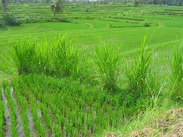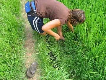Susi sucht ihren Badelatschen im Reisfeld, Ubud, Bali |