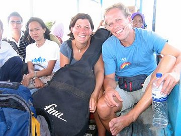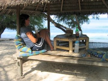 Nachdem wir in NZ doch eher gefroren haben und Baden im Meer eine echte Herausforderung war, ist es nun mal wieder Zeit, Sonne, Strand und Meer zu geniessen. Wir entschliessen uns deshalb von Bali nach Lombok ueberzusetzen und dort etwas auf einer der drei bekannten Gilis (Inseln) zu verweilen. Waehrend der etwa 5 bis 6 stuendigen Ueberfahrt mit der Faehre haben wir genuegend Zeit, um uns ueber das Reiseziel klar zu werden und entscheiden uns fuer die mittlere Insel sprich Gili Meno. Am Hafen steigen wir in einen Minibus und fahren ca. 1 Stunde Richtung Norden nach Senggigi. Dort verbringen wir die Nacht, bevor es am naechsten Morgen frueh weiter zum Hafen geht. Wir suchen den kompletten Ort natuerlich nach einer Bar, Kneipe, Restaurant oder was auch immer, mit Fernseher ab, um die Partie Offenbach gegen Frankfurt zu sehen. Leider finden wir keine Lokalitaet, die das Spiel der Spiele uebertraegt. So stehen wir am naechsten Morgen wenigstens halbwegs ausgeschlafen am Strassenrand und warten auf unseren Bus. Der kommt natuerlich nicht wie verabredet, sondern erst einige Zeit spaeter. That's Asia ! Kein Problem fuer uns, aber wir haetten noch etwas laenger an der Matratze horchen koennen ...