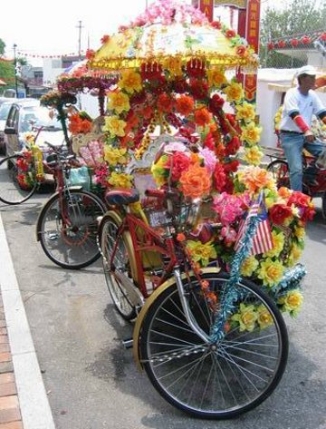 Dreiraeder ziehen an uns vorbei. Neben Chinatown gibt es noch ein schoenes Viertel mit einigen Gebaeuden