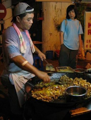 mit Heisshunger auf die kleinen Staende. Ein aelterer Mann aus Singapur gesellt sich zu uns und verwickelt