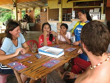wir auf das Boot warten sitzen wir ein letztes Mal in lustiger Runde beisammen und spielen.
