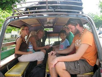 Songtheaw (kleiner ueberdachter Pritschenwagen mit Baenken laengs zur Fahrtrichtung) in die