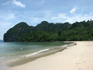 Ein kleiner Sandstrand umrahmt von Palmen, dahinter schliesst eine riesige Felsenwand die